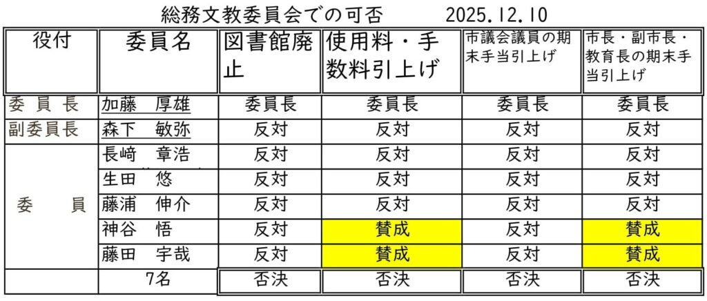 まず委員会で否決12月10日総務文教委員会で付託された議案が審議されました。 このうち図書館中部分館の廃止、使用料・利用料の上げ、市議会議員と市長、副市長、教育長の期末手当引上げの4議案が否決されました。「財政非常事態宣 ... 続きを読む →