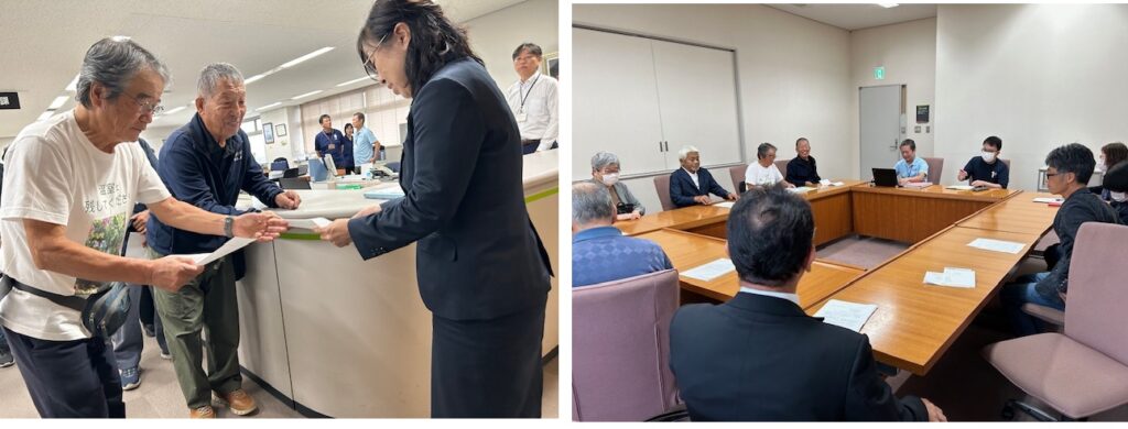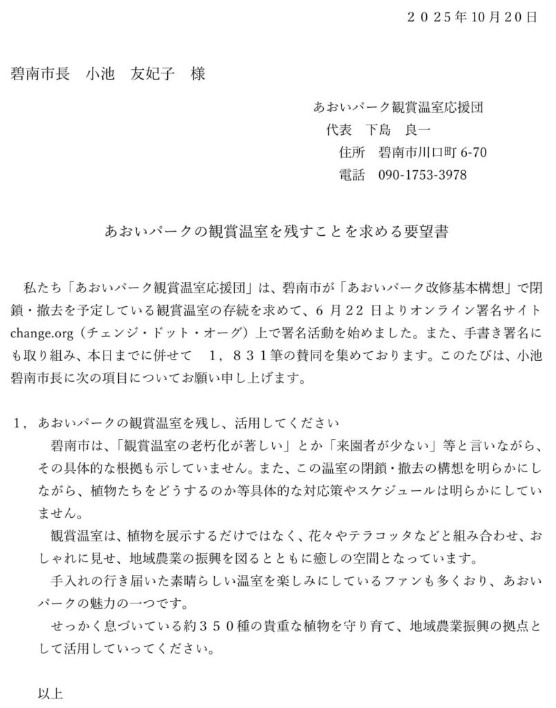 10月20日「あおいパーク観賞温室応援団」代表下島良一さんなど12名が、小池友妃子市長に要望書1831人分を手渡しました。
