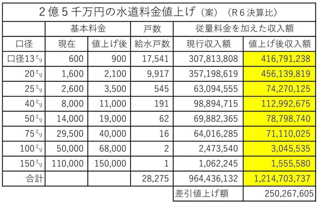 水道審議会で引上げを提案。基本料金も従量料金も引上げ年間2億5千万円アップとなります。実施は令和9年2月と予定。6月か9月議会に議案提案の予定です。
