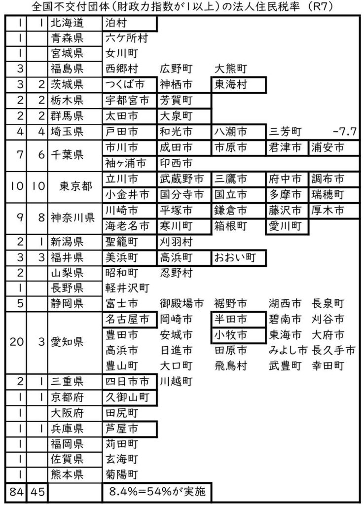 「市民負担の前に、法人市民税を6%から8.4%にして財源確保を」の要望に「不交付団体で8.4%はない」と市当局が答弁しました。調査ではR7年度全国84自治体不交付団体のうち45自治体54%県内でも3市が実施しています。行政が市民にウソを言ってはいけません。非常事態宣言への怒り、不満が大きく広がっています。